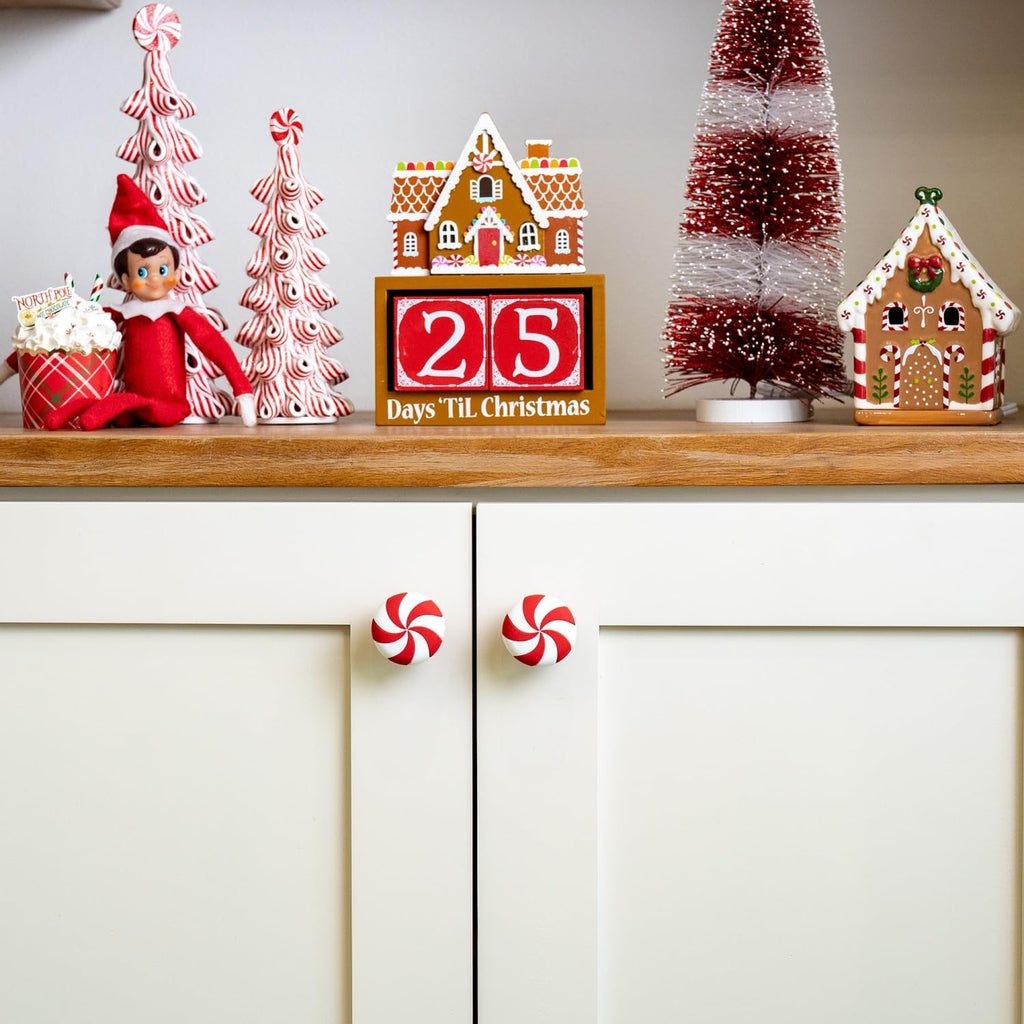 Festive red peppermint themed knob covers designed for holiday decorating.