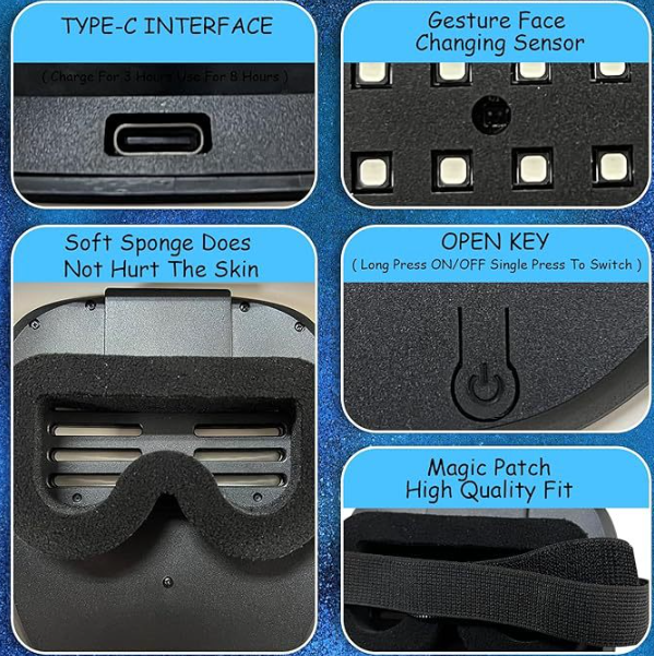 Gesture‑activated LED face mask that responds to hand waves to change display patterns.