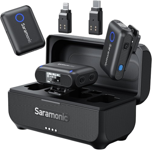 Wireless lavalier microphone system with up to 492ft transmission range.