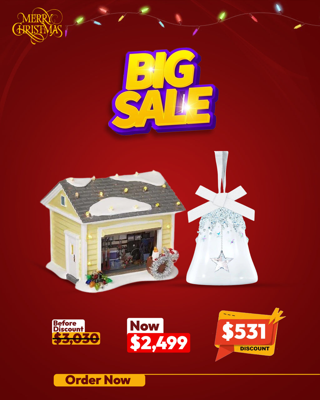 Snow Village Christmas Vacation Griswold Holiday Garage Lit BuildingOriginal Price: $57.00SKU: AFD-035187Units: 30Bell & Star Holiday Ornament, Small, Clear CrystalsOriginal Price: $37.00SKU: AFD-035225Units: 30